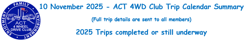 | 9/12/2025 | Tuesday 6.30pm | ACT4WD Club Christmas party | Eddy Hoek | |||