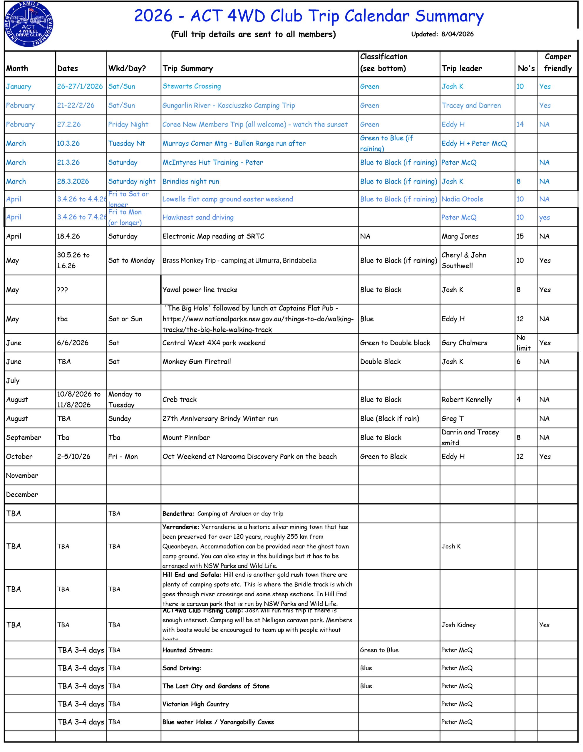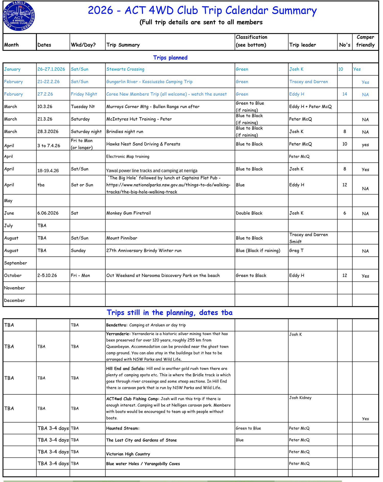 | Dates | Wkd/Day? | Trip Summary | Classification (see bottom) | Trip leader | No’s | Camper friendly |